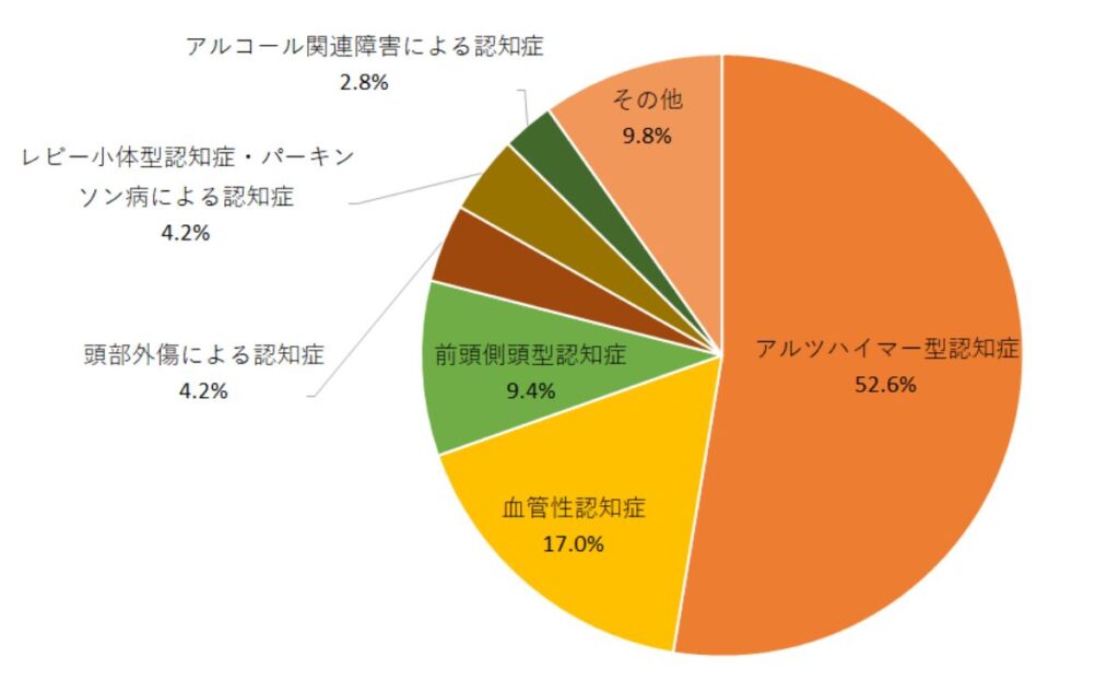 若年性認知症はアルツハイマー型認知症がもっとも多く、血管性認知症・前頭側頭型認知症を含めると全体の約8割を占めています。