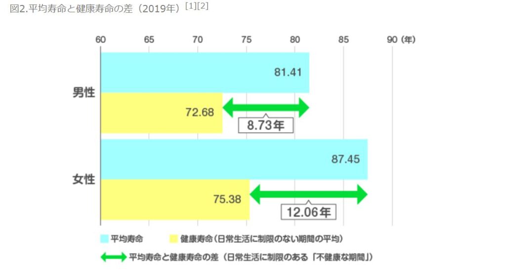 厚生労働省の調査では、平均寿命と健康寿命とは男性が約9年、女性が約12年の差があります。