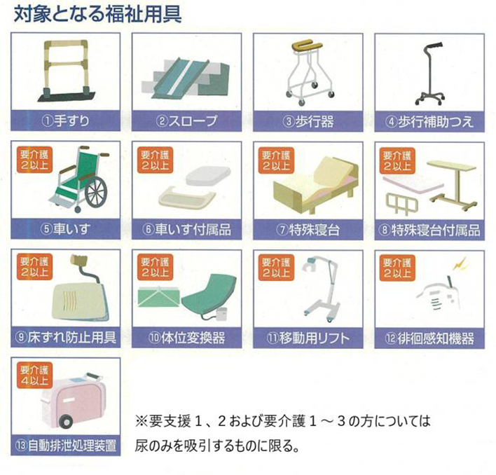 福祉用具貸与の対象は以下の13品目で、要介護度に応じて違います。